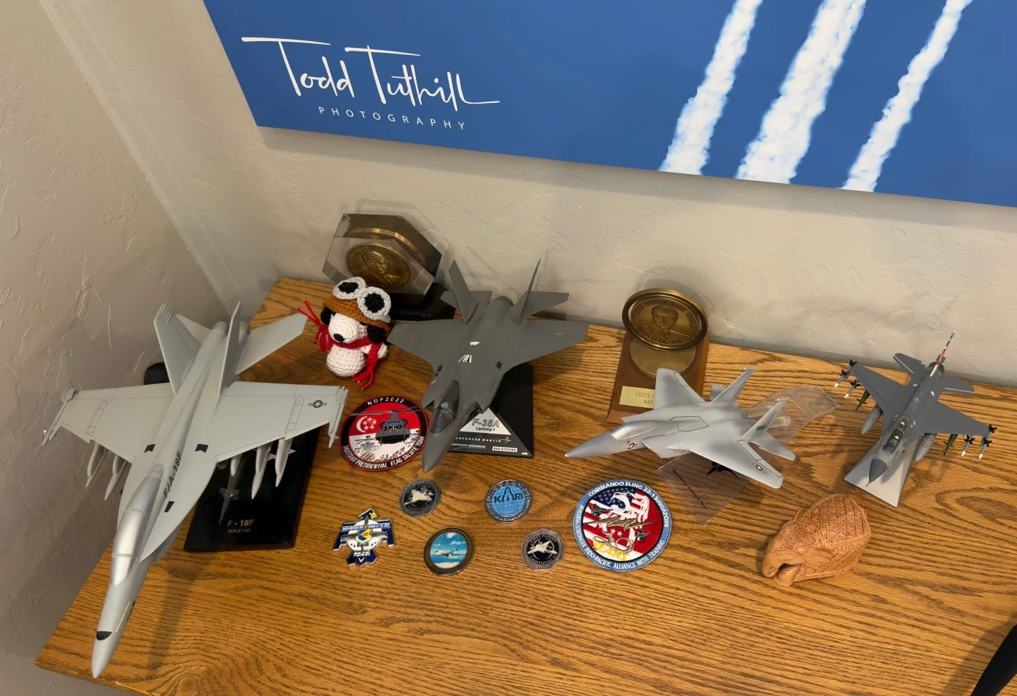 I have models of jets, and coins from first flights and test programs on the table behind me.