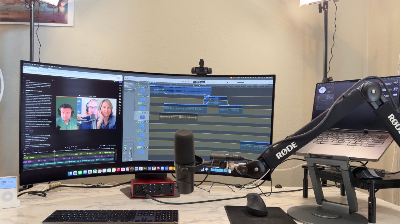 We record with an online tool called Riverside. https://Riverside.FM That is the app in the Chrome window on the left. If you are recording podcasts straight to a DAW and editing the old way: Stop wasting so much time! You have to check out a tool like Riverside. It is full of some great AI. AI that is not just hype, it really helps. There are Easy Buttons to find and remove all the ums and pauses, and another one that can almost make audio recorded on a laptop mic sound like it was recorded in a studio. Riverside converts all spoken words to text, organized by speaker. You can also remove sections of audio by just selecting a whole paragraph of text and pressing delete. It will auto smooth the audio and video cuts and transitions for you.